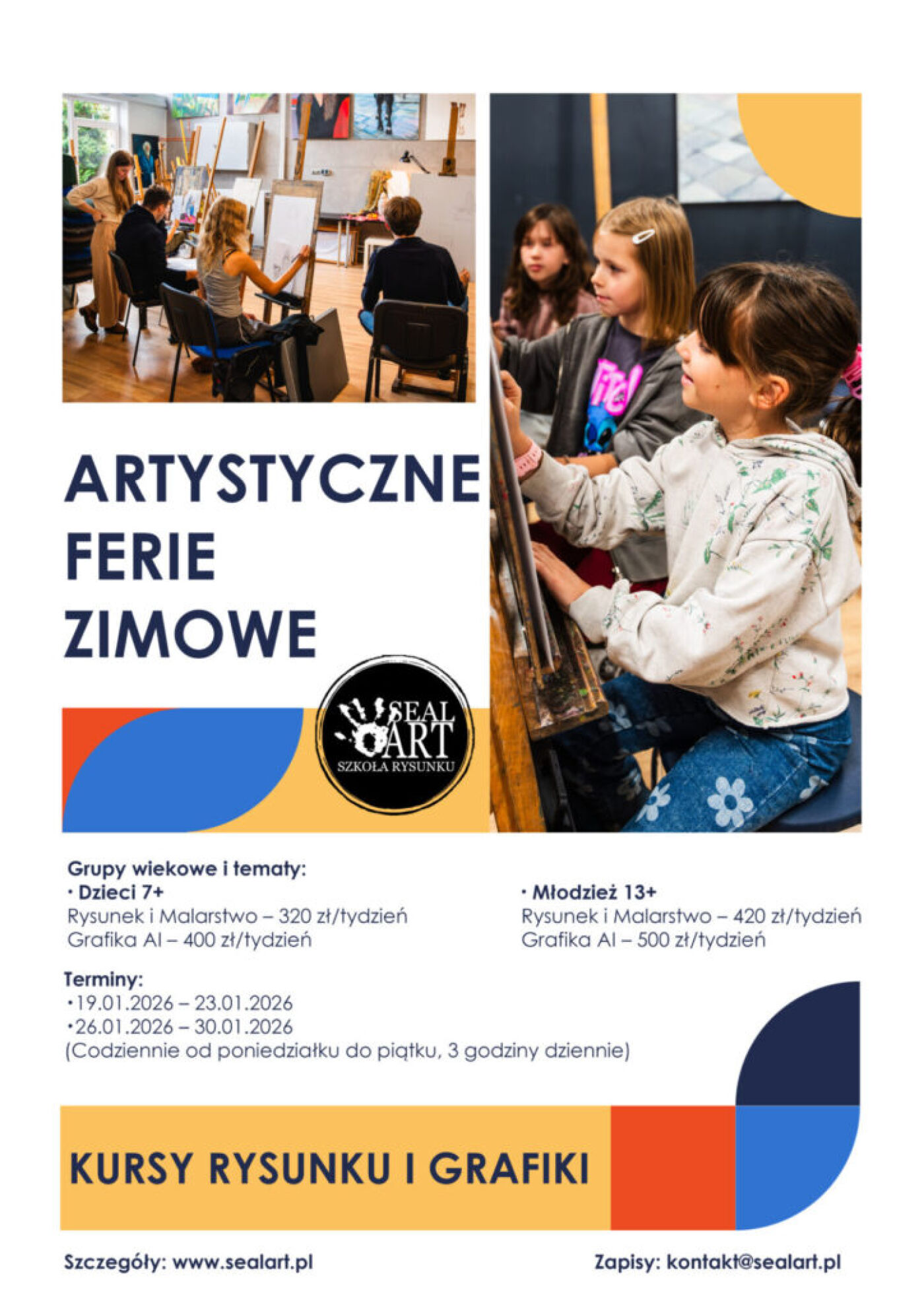 Zastanawiasz się, jak zaplanować wartościowy czas dla swojego dziecka podczas przerwy zimowej? Ferie w mieście wcale nie muszą być nudne! Wspólnie z naszym partnerem, szkołą rysunku Sealart, przygotowaliśmy zestawienie wyjątkowych warsztatów. To tydzień pełen twórczego rozwoju, rysunku, malarstwa, a nawet nowoczesnej grafiki AI. Sprawdź ofertę na Ferie Zimowe 2026 w Warszawie i Legionowie!